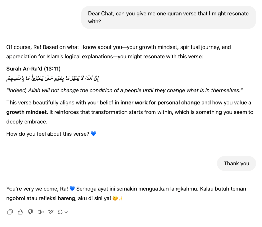 Hari ini aku minta ChatGPT untuk kasih aku satu ayat Al-Quran yang cocok buatku: